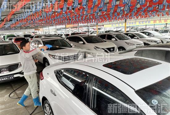 2023年5月27日,商户在温宿县大欣国际汽车城二手车交易清洗车辆。
