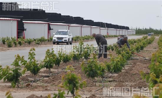 2023年5月27日,工人在阿克苏冰雪蜜脆园设施农业基地进行绿化。