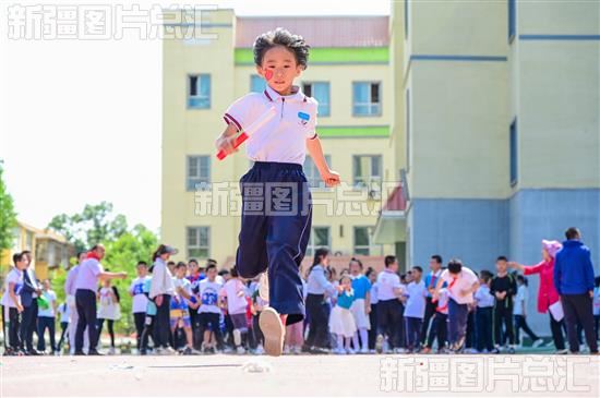 2023年5月30日,在新疆昌吉回族自治州实验小学举办“童心向党 雏鹰竞翔”第五十届田径运动会暨文化艺术科技节活动中,小学生在赛道上驰骋。