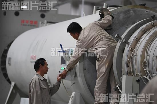 2023年5月29日,工人在库车新桥管业有限公司车间检查设备运行情况。