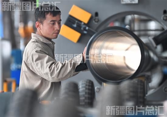 2023年5月29日,工人在库车新桥管业有限公司车间生产涂塑复合钢管。