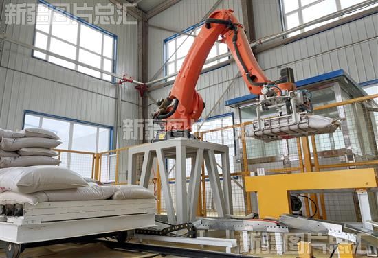 2023年5月29日,机械在在位于库车经济技术开发区的新疆诚润金兰生物科技有限公司车间搬运脱粉棉蛋白。