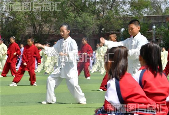2023年5月30日,乌鲁木齐市第七十七中学学生表演太极拳。