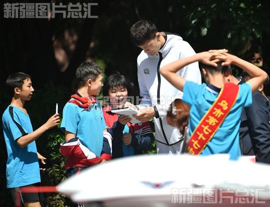 2023年5月30日,乌鲁木齐市第七十七中学学生在校园内与新疆广汇男子篮球队队员朱传宇(右二)互动。