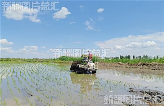 2023年5月29日,农户驾驶插秧机在沙湾市乌兰乌苏镇王家梁村水稻田作业,田间地头呈现出一派繁忙景象。