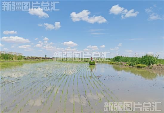 2023年5月29日,农户驾驶插秧机在沙湾市乌兰乌苏镇王家梁村水稻田作业,田间地头呈现出一派繁忙景象。
