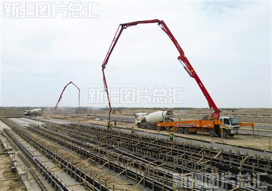 2023年5月25日,在尉犁县兴平镇达西村新疆羌都天保羊业40万只种羊养殖项目施工现场看到,工人们正在混凝土浇筑作业。