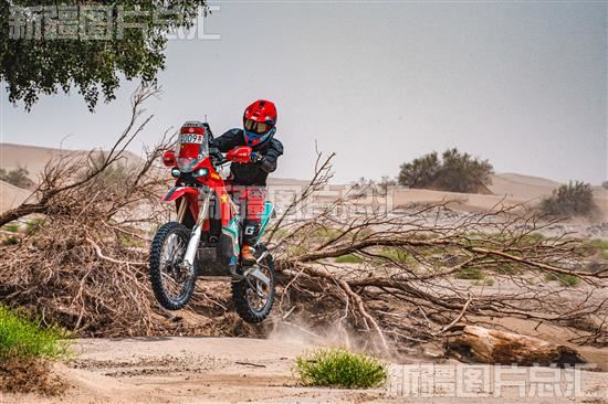 2023年5月30日,一辆摩托车赛车在尼雅赛段飞跃沙丘。