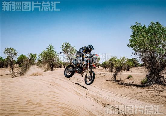 2023年5月29日,一辆参赛的摩托车在克里雅河赛段飞跃沙坑。
