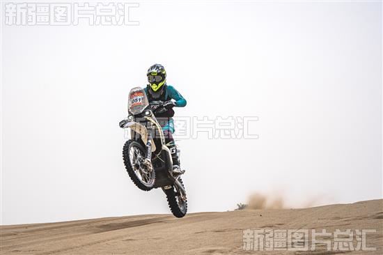 2023年5月23日,一名摩托车选手在SS3麦盖提N39赛段冲上沙坡。