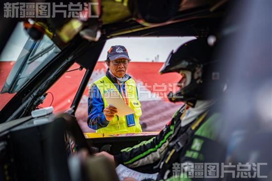 2023年5月26日,2023中国环塔(国际)拉力赛进行第五赛段比赛,这也是本届赛事的第二个转场赛段——由麦盖提n39大营向和田大漠胡杨景区大营转场。图为在位于n39景区的起点,一名裁判正在给参赛车手发放时间表。