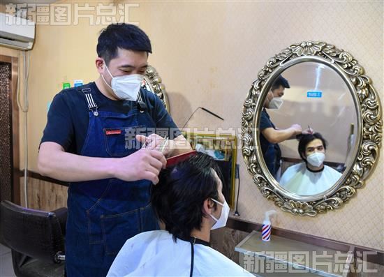2022年11月28日,在乌鲁木齐市文化路上的“520”理发店,员工正为预约的市民理发。