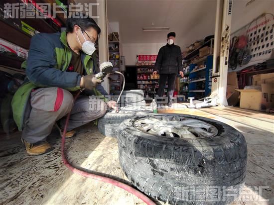 2022年11月28日,工作人员在乌鲁木齐市西虹西路一家汽修店为车主换雪地胎。