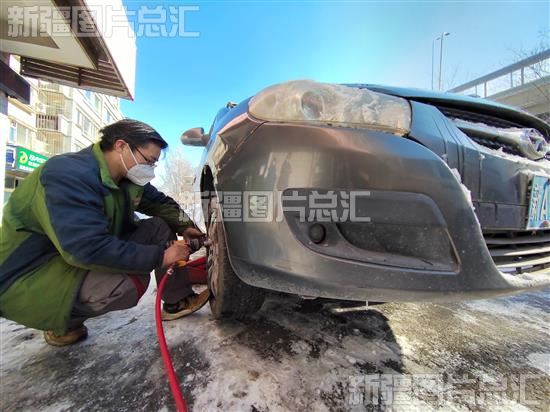 2022年11月28日,工作人员在乌鲁木齐市西虹西路一家汽修店为车主换雪地胎。