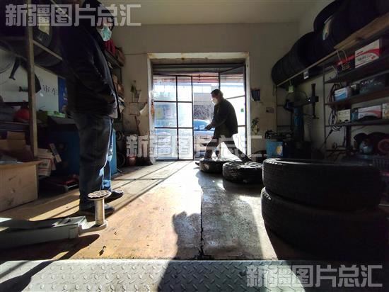 2022年11月28日,工作人员在乌鲁木齐市西虹西路一家汽修店为车主换雪地胎。