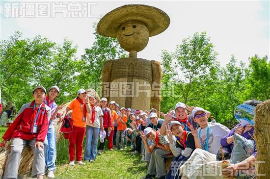 2023年6月1日,学生在位于昌吉市的新疆农业博览园内的巨型“稻草人王国”游玩拍照。