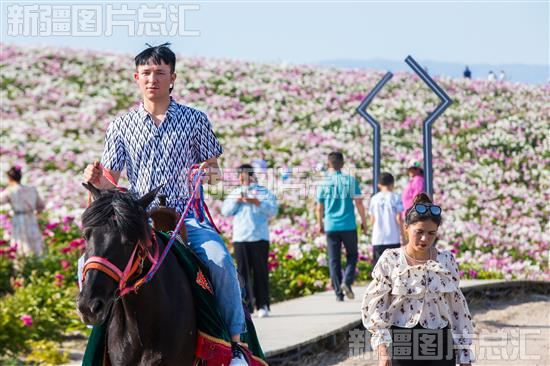 6月1日,在博乐市乌图布拉格镇介格得布拉格村芍药花基地,游客在体验骑马娱乐项目。
