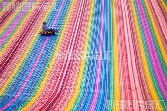 2023年6月1日,游客在博乐市乌图布拉格镇介格得布拉格村芍药花基地体验彩虹滑道项目。