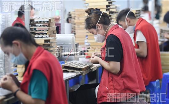 2023年6月1日,工人在和田瓴海电子有限责任公司车间生产电子产品部件。