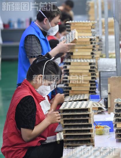 2023年6月1日,工人在和田瓴海电子有限责任公司车间生产电子产品部件。