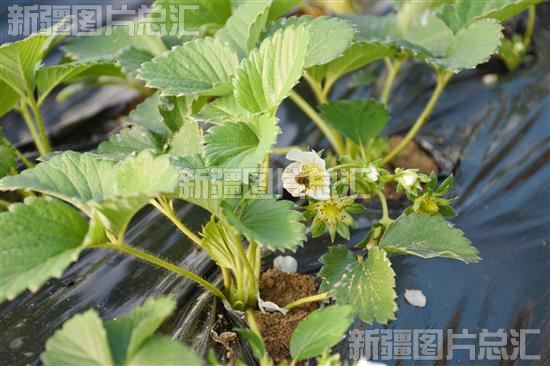 2022年11月26日,在沙湾市玲珑心草莓采摘园蜜蜂给白色的草莓花授粉。