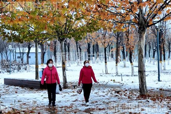 2022年11月24日,察布查尔锡伯自治县冬日初雪后的景色迷人。在察布查尔锡伯自治县新城区公园里、道路旁,呈现出层林尽染,色彩斑斓,黄叶映白雪,红果照蓝天的美丽景色,构成一幅幅美丽的画卷。