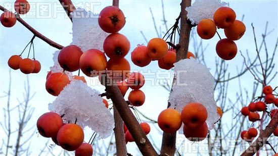 2022年11月24日,在察布查尔锡伯自治县新城区人行路边,雪压满枝野果,让人醉。