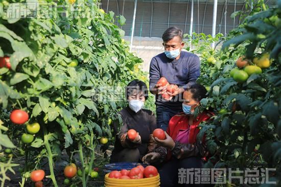 2022年11月15日,博湖县本布图镇设施农业产业园大棚内西红柿喜获丰收,工人正在采摘。
