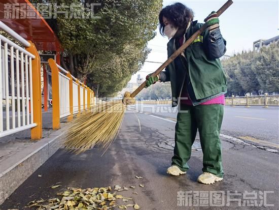 2022年11月16日,环卫工在伊宁市解放路扫除落叶。