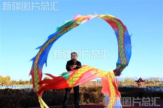 2022年11月14日,裕民县城镇居民在锦裕生态公园内舞动彩带龙健身。