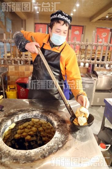 2023年6月1日,商户在新疆国际大巴扎景区美食街制作美食。