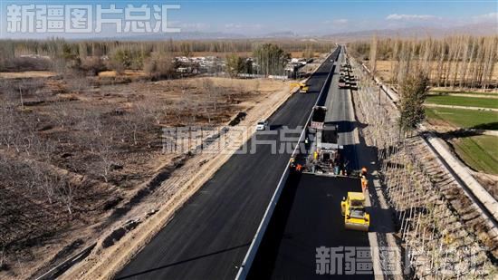 2022年11月14日,国道579线高等级公路第五合同段施工现场,工人们正在摊铺沥青。国道579线高等级公路(二期)工程总投资41.88亿元,是“丝绸之路经济带”核心区的重要交通干线,总里程186.20公里,采用双向四车道一级公路标准建设。据了解,该工程预计明年6月正式通车。