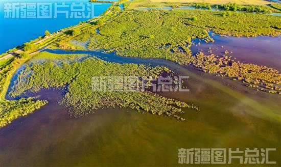 2023年6月3日,从空中俯瞰,夕阳下的呼图壁县小海子湿地绿意盎然,水草丰茂,风景如画(无人机拍摄)。
