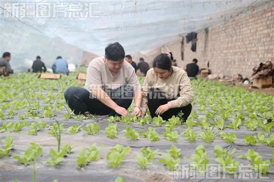2023年3月15日,在六师101团青湖镇一连蔬菜大棚,菜农正在移栽快菜苗。