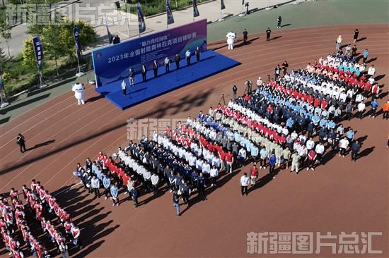 2023年6月4日,运动员在克拉玛依大学城田径场举行开赛仪式(无人机拍摄)。