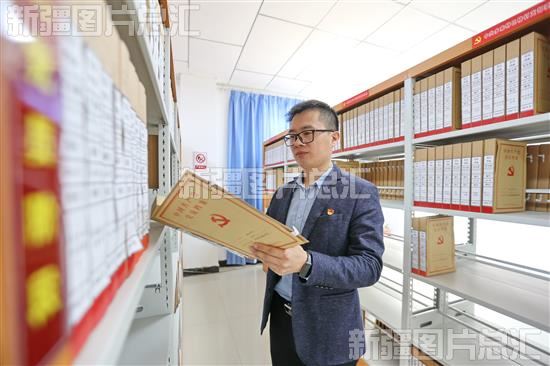 2023年3月7日,库车市伊西哈拉镇党员档案室管理人员正在整理党员档案。