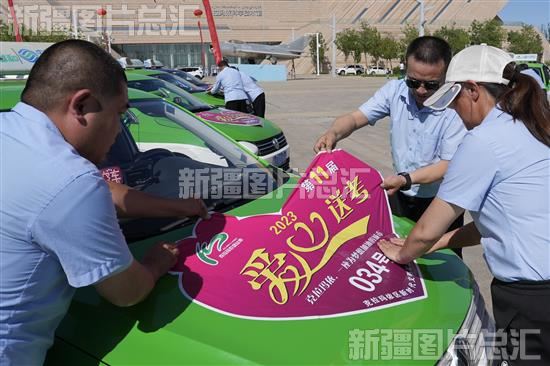 2023年6月3日,克拉玛依科技馆广场,出租车司机粘贴爱心送考标识。