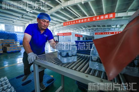2023年6月6日,霍尔果斯市的新疆天然泉饮品集团有限公司员工在生产车间流水线作业。