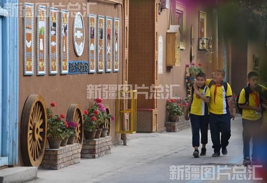 2023年6月5日,放学回家小朋友行走在阿图什市松他克镇阿孜汗村文化街巷。