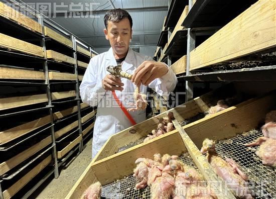 2023年6月5日,工人在阿图什市威望生态养殖科技有限责任公司育雏室为幼乳鸽喂食。该公司乳鸽养殖示范项目2020年10月成立,是专业的乳鸽人工孵化、人工哺育、研制乳鸽前期配合饲料(人工鸽乳)、乳鸽灌喂技术培训等集于一身的权威化的大规模养殖基地。阿图什市现代农业产业园位于阿图什市松他克镇克青孜村,示范园2020年成立,占地20万亩,投入 8000 万元建设新疆红羊养殖项目,投入3000 万元新建 5000 亩饲草基地配套建设项目。