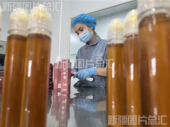 2023年6月6日,员工在新疆开心弘盛药业有限公司厂房包装药茶。