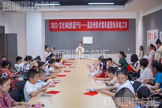 2023年6月10日,学生在昌吉回族自治州美术馆学习体验剪纸艺术。