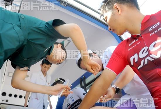 2023年6月12日,医护人员为参加环湖赛的受伤选手医治。