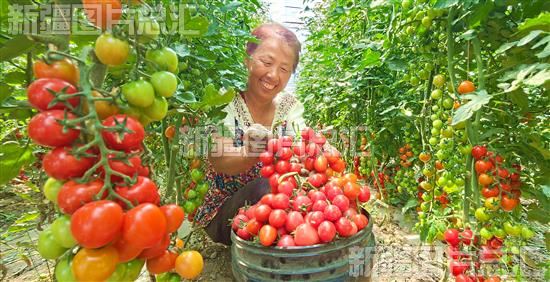 2023年6月12日,察布查尔锡伯自治县米粮泉回族乡米粮泉村圣女果大棚内,果农采摘客商预订的圣女果。