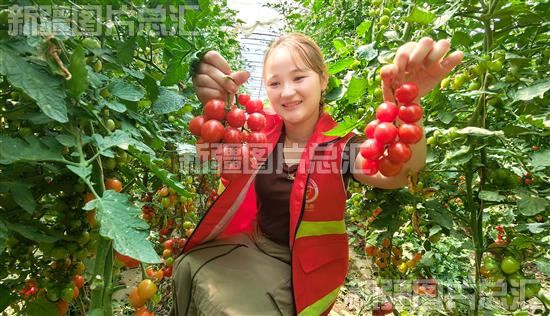 2023年6月12日,察布查尔锡伯自治县米粮泉回族乡米粮泉村圣女果大棚内,工作队队员采摘客商预订的圣女果。