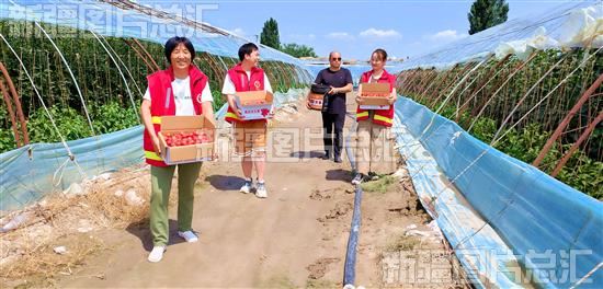 2023年6月12日,察布查尔锡伯自治县米粮泉回族乡米粮泉村圣女果大棚种植基地,工作队队员帮助果农搬运圣女果。