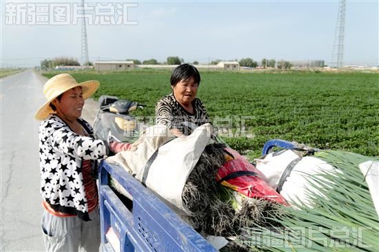 2023年6月13日,新疆生产建设兵团第二师22团15连职工在色素辣椒田地搬运大葱运往市场销售。