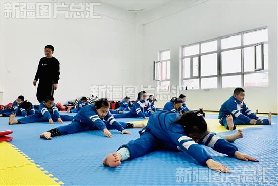 2023年3月14日,在呼图壁县第一小学幸福校区跆拳道社团里,同学们正在老师指导下进行拉伸运动。