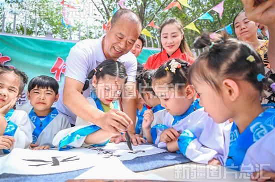 2023年6月19日,书法爱好者给小朋友传授书法技艺。