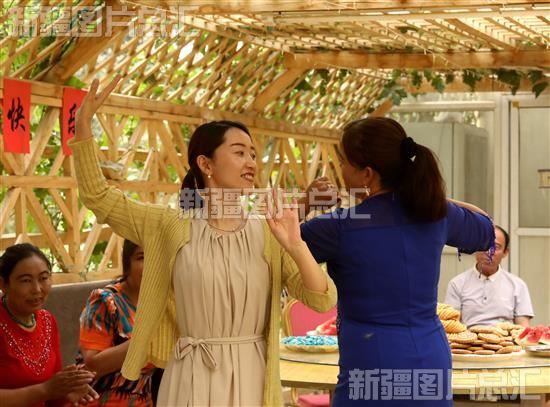 2023年6月18日,河北唐山援疆干部与村民挑起欢快舞蹈。